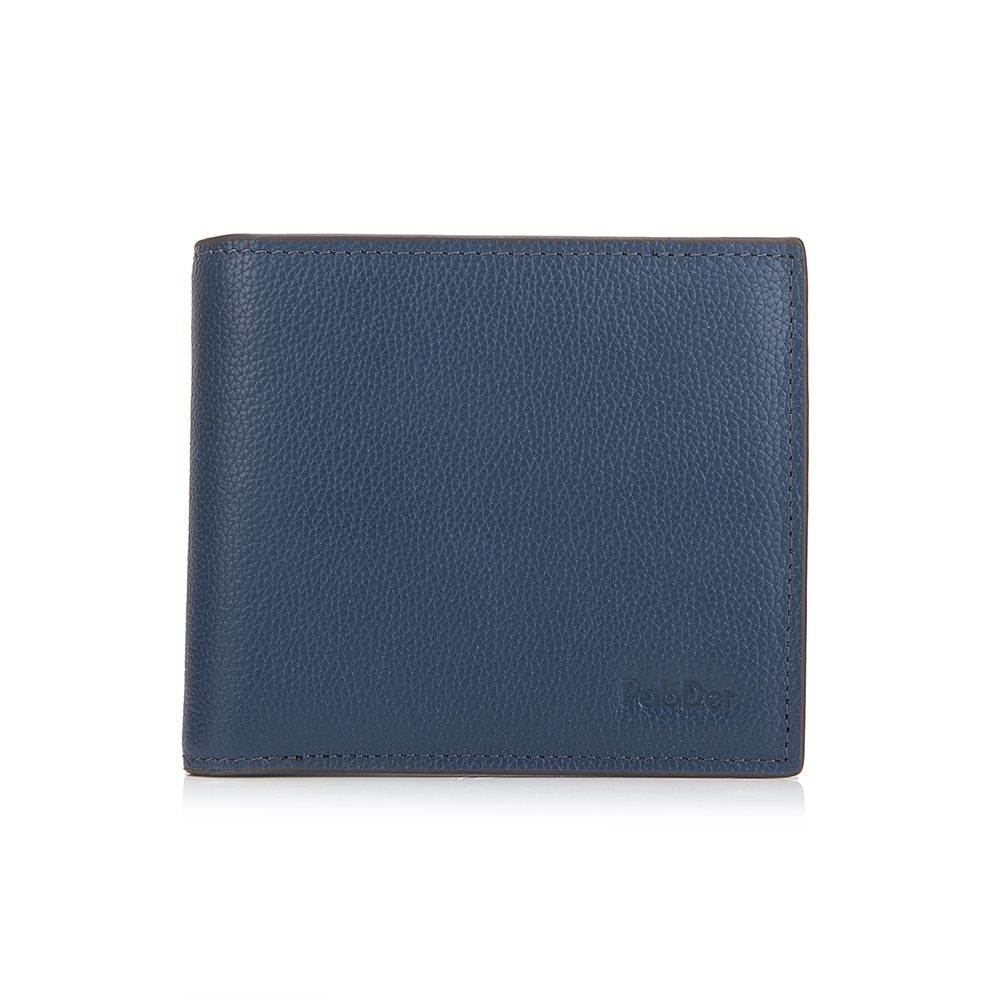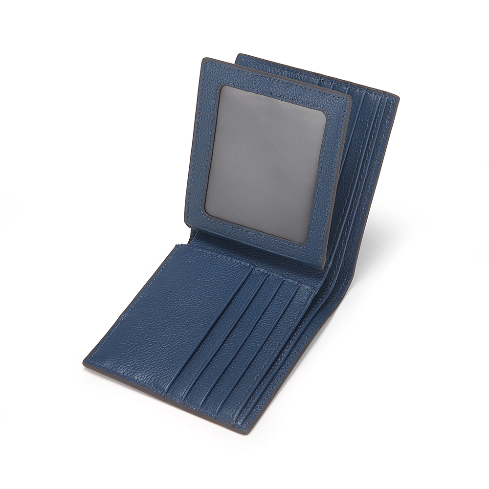 Men's leather bi-fold wallet. Embossed leather with all-around side stitching. 12 card slots can hold up to 20 cards.