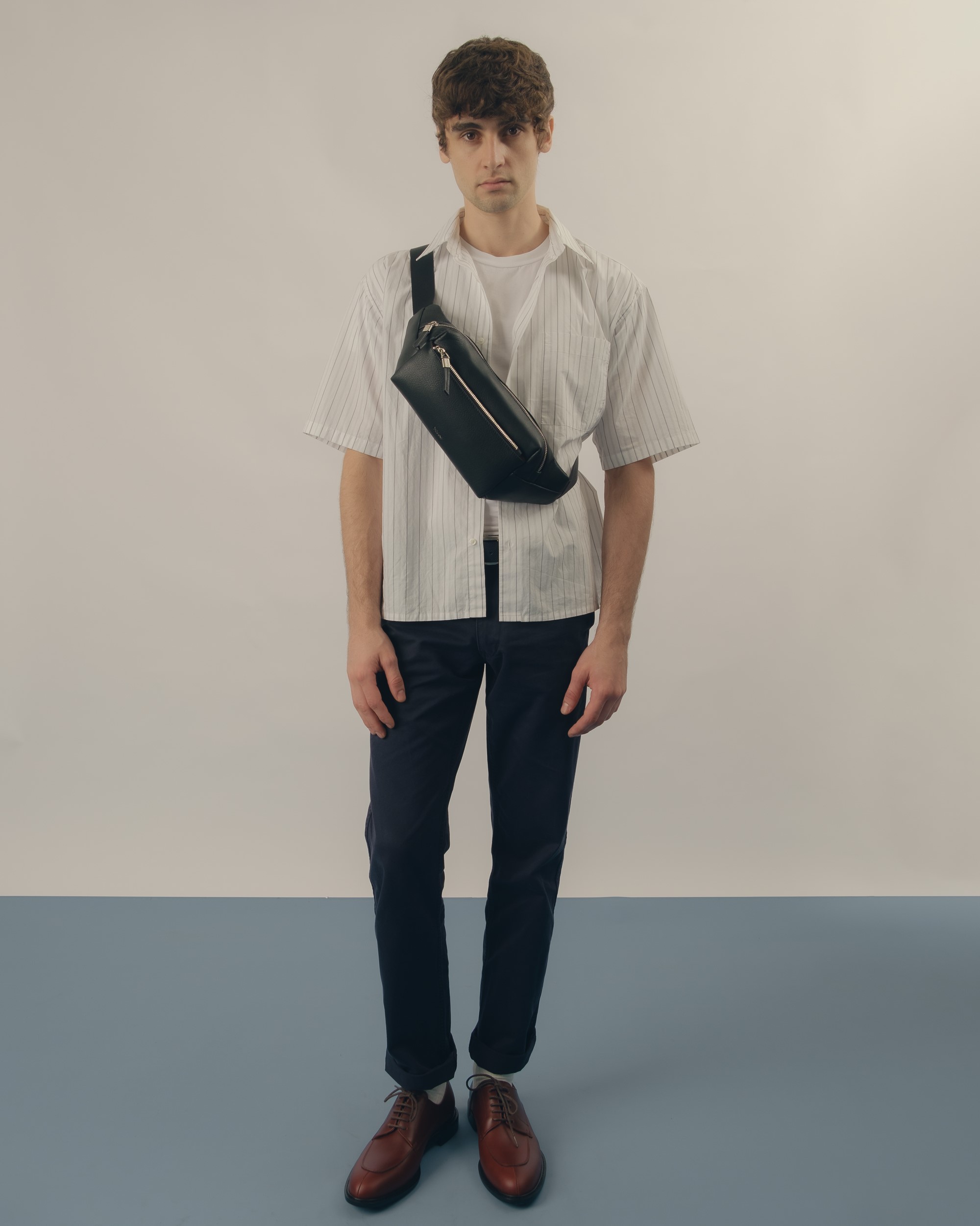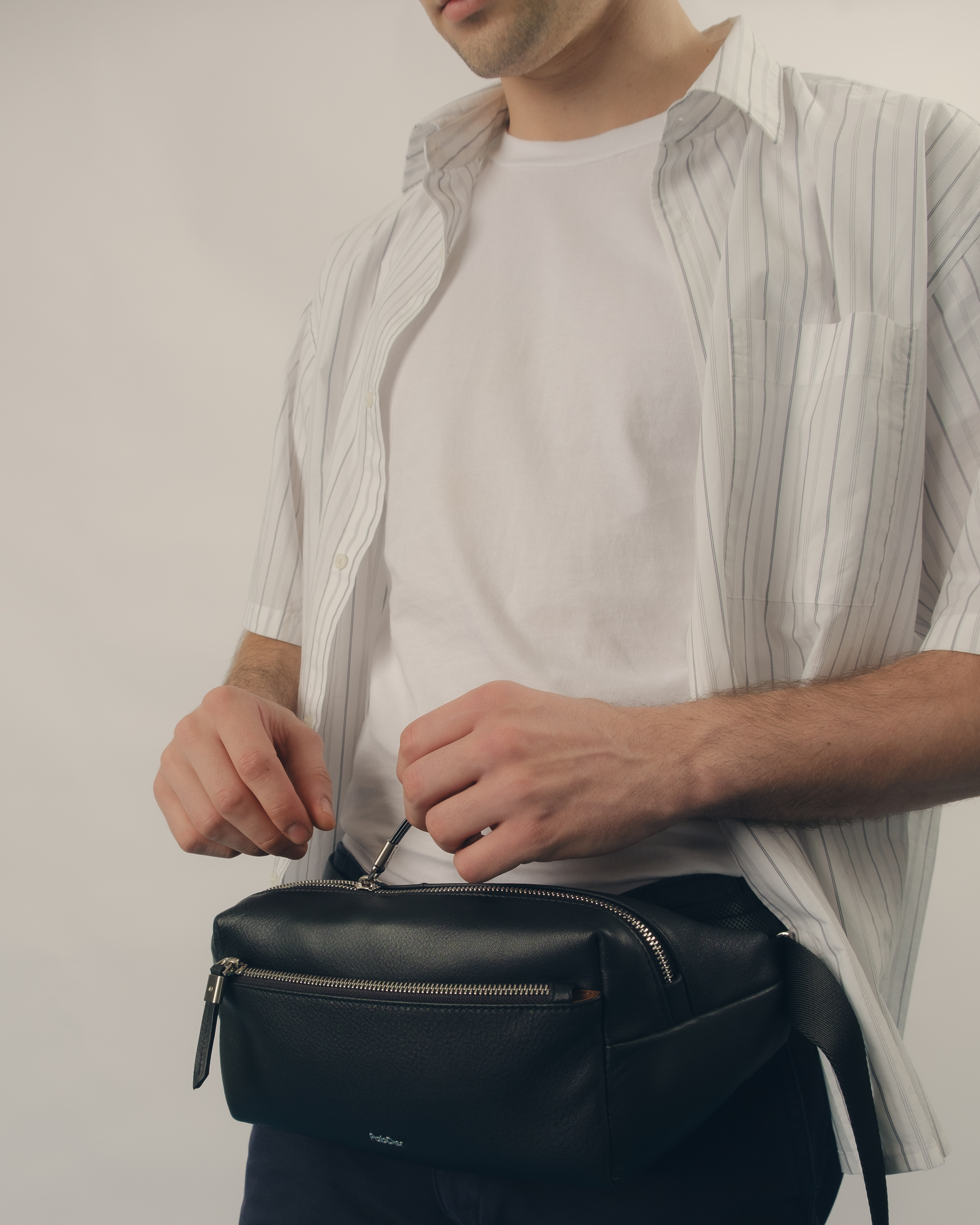 large carry capacity spacious bum bag with 3 pockets and adjustable strap for crossbody carry. Dimensions: 13in x 5in x 3.5in