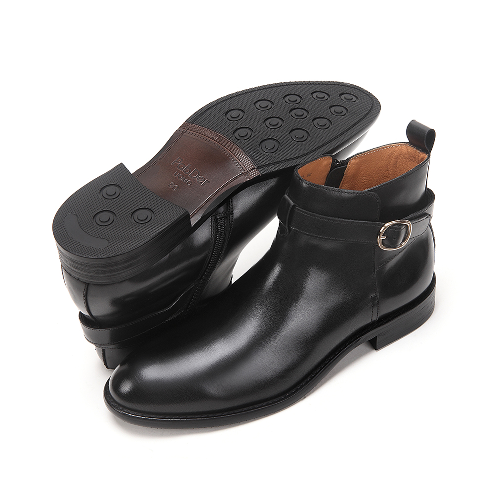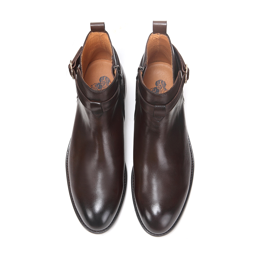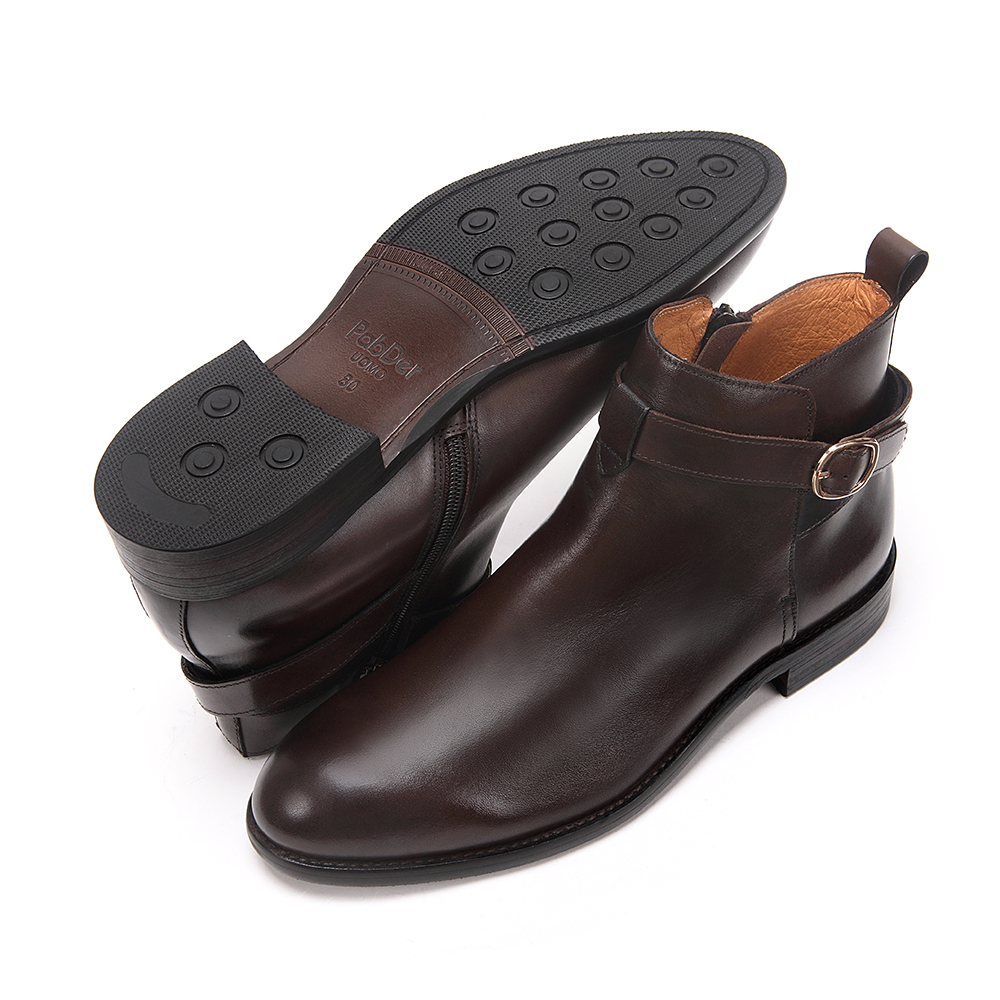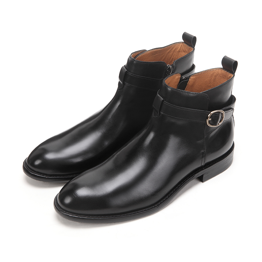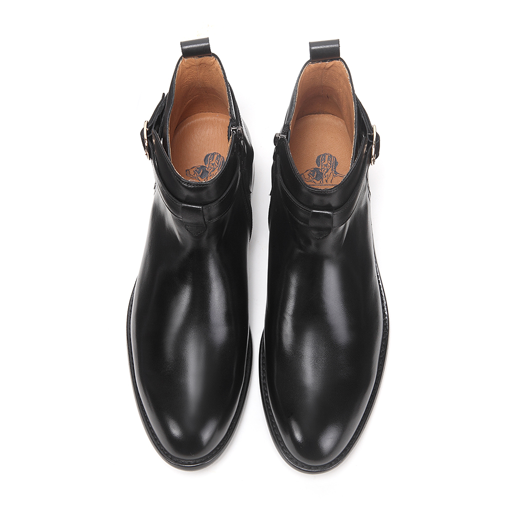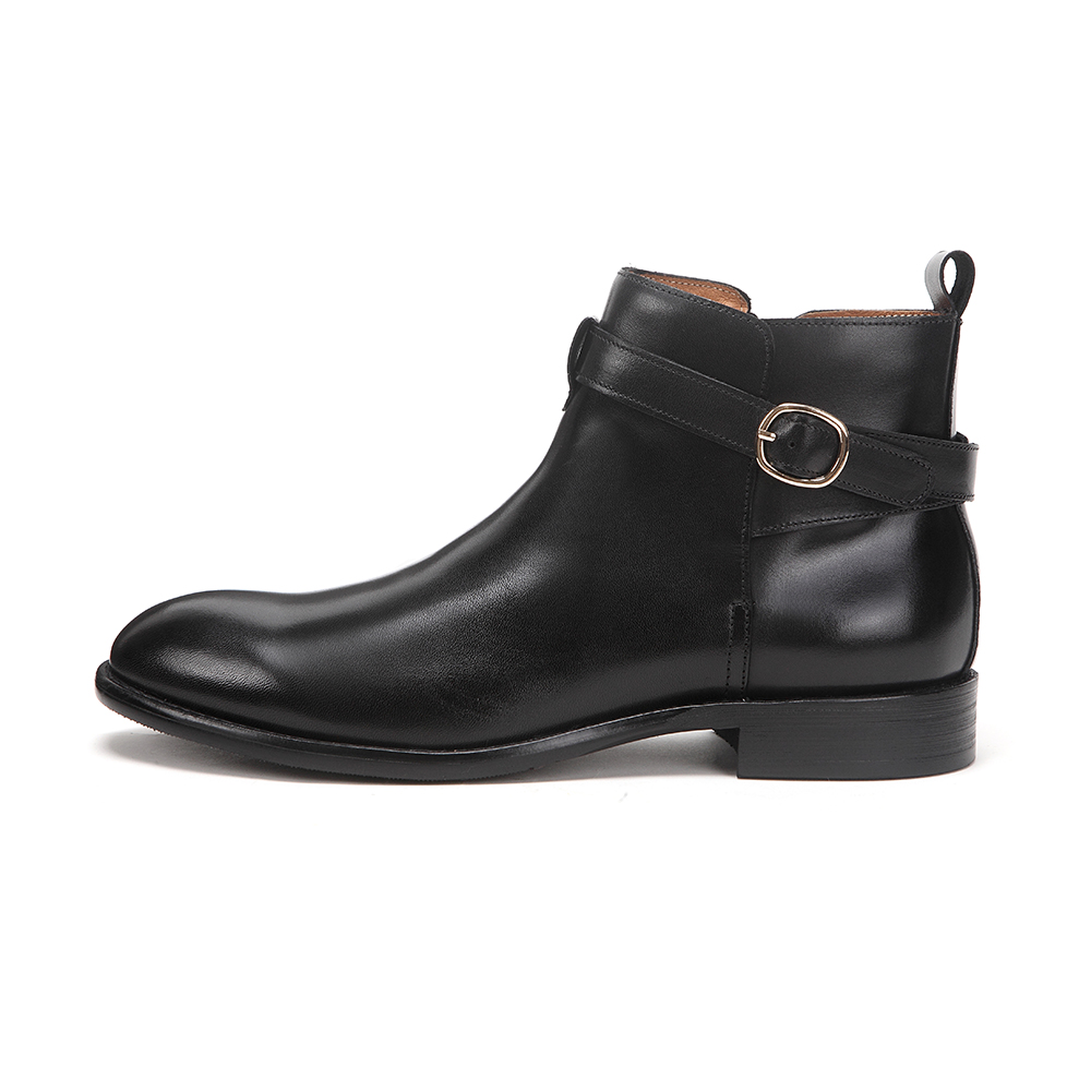 A contemporary take on the classic Jodhpur, made with genuine calf leather and a side zip for easy removal and wear. Featuring a rose gold metal buckle. 4in ankle height.