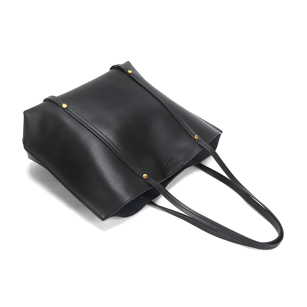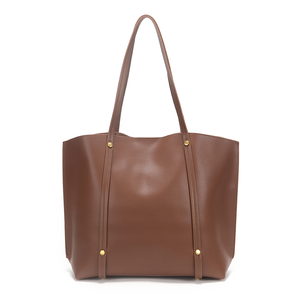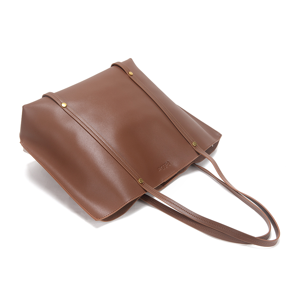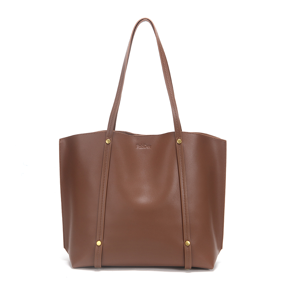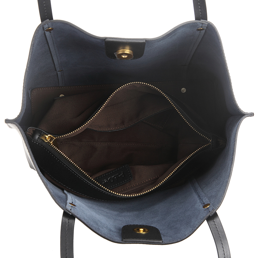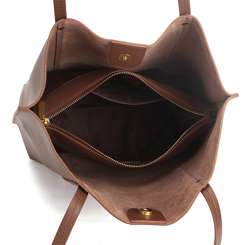 Medium sized leather tote with magnetic closure and inner zippered detachable pouch and top handle carry. Dimensions: 12in x 11.5in x 12in