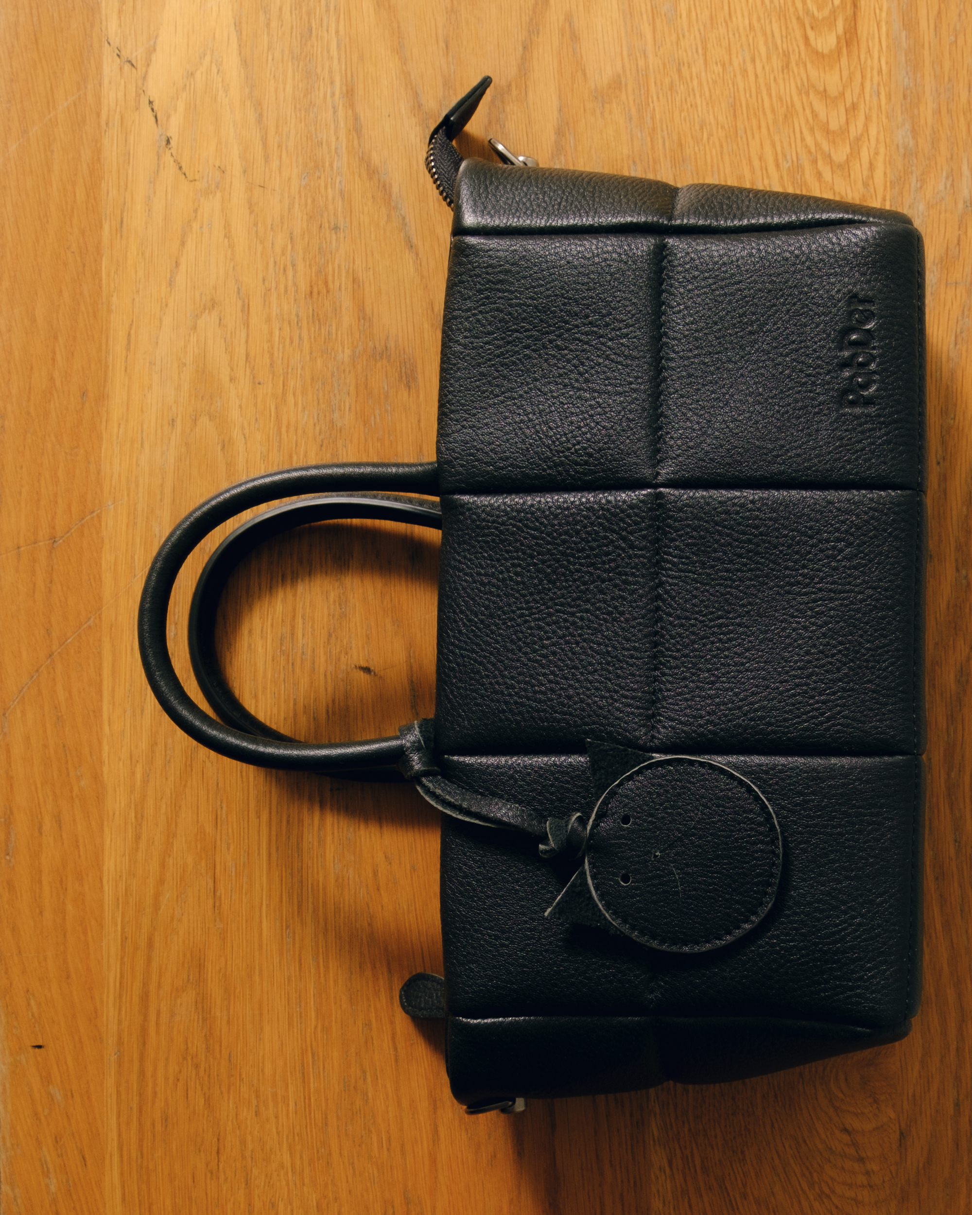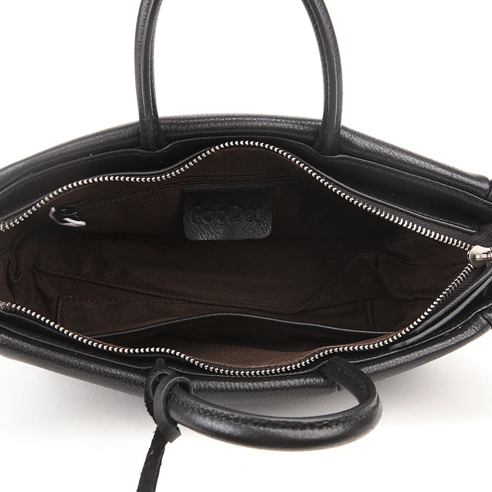 Top handle leather patched purse with leather kitty trinket. Features 1 large zipper opening compartment with leather detachable sling strap.