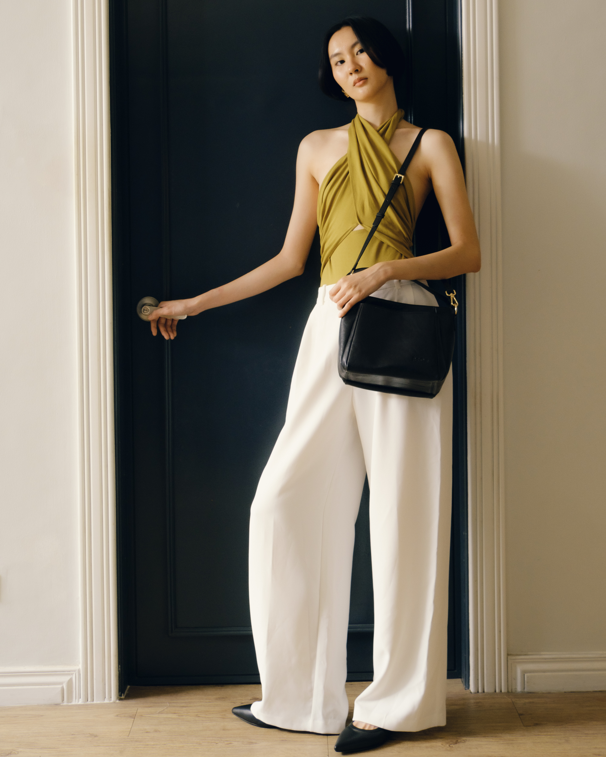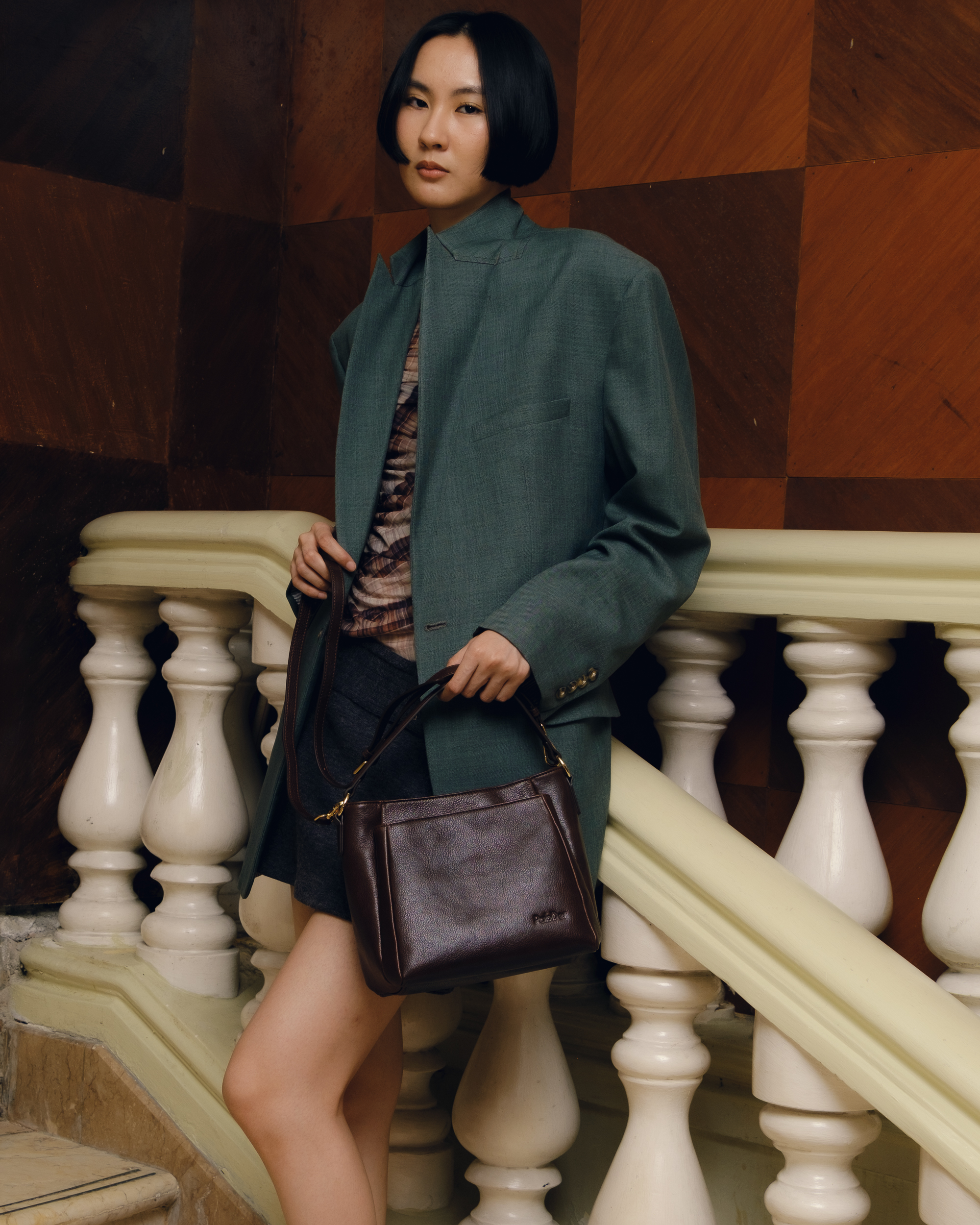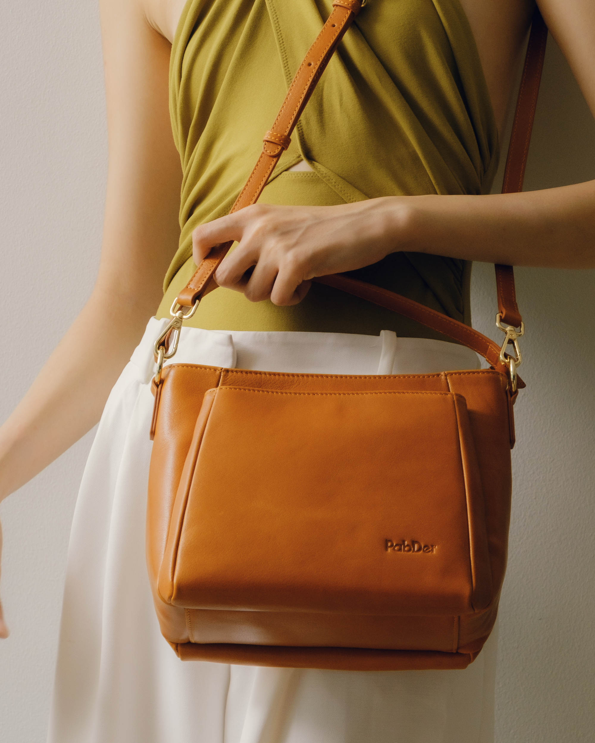 Top handle bucket bag with adjustable and removable sling strap. Made with genuine leather. 1 large zippered compartment with 2 smaller magnetic closure compartment.