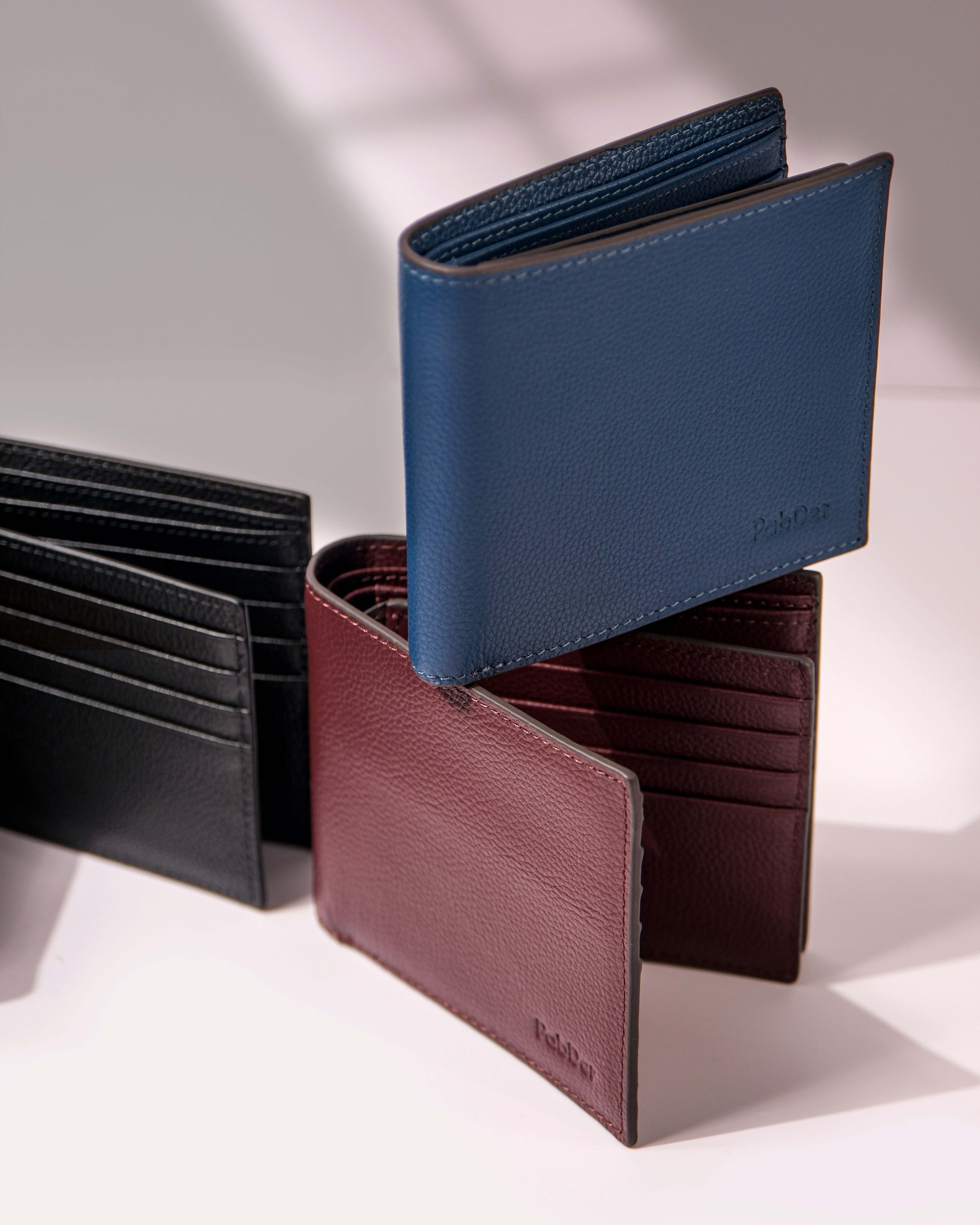 Men's leather bi-fold wallet. Embossed leather with all-around side stitching. 12 card slots can hold up to 20 cards.