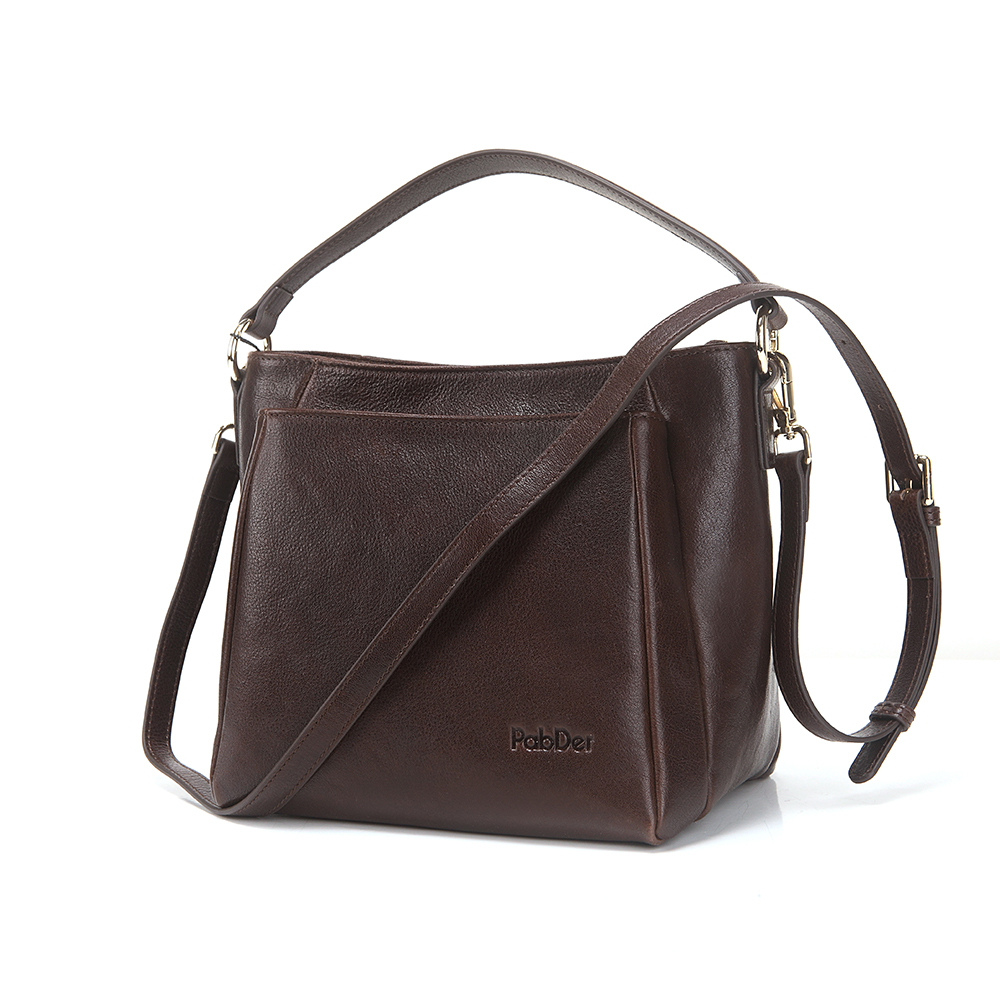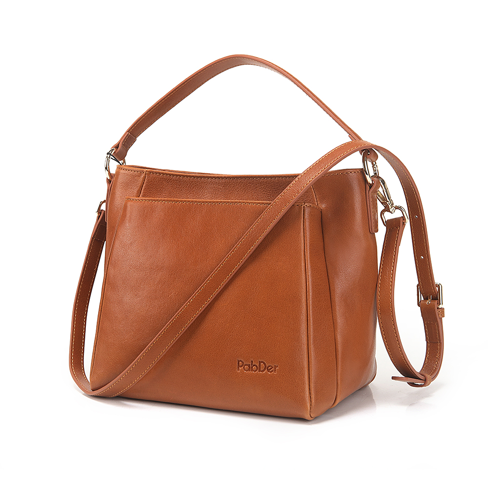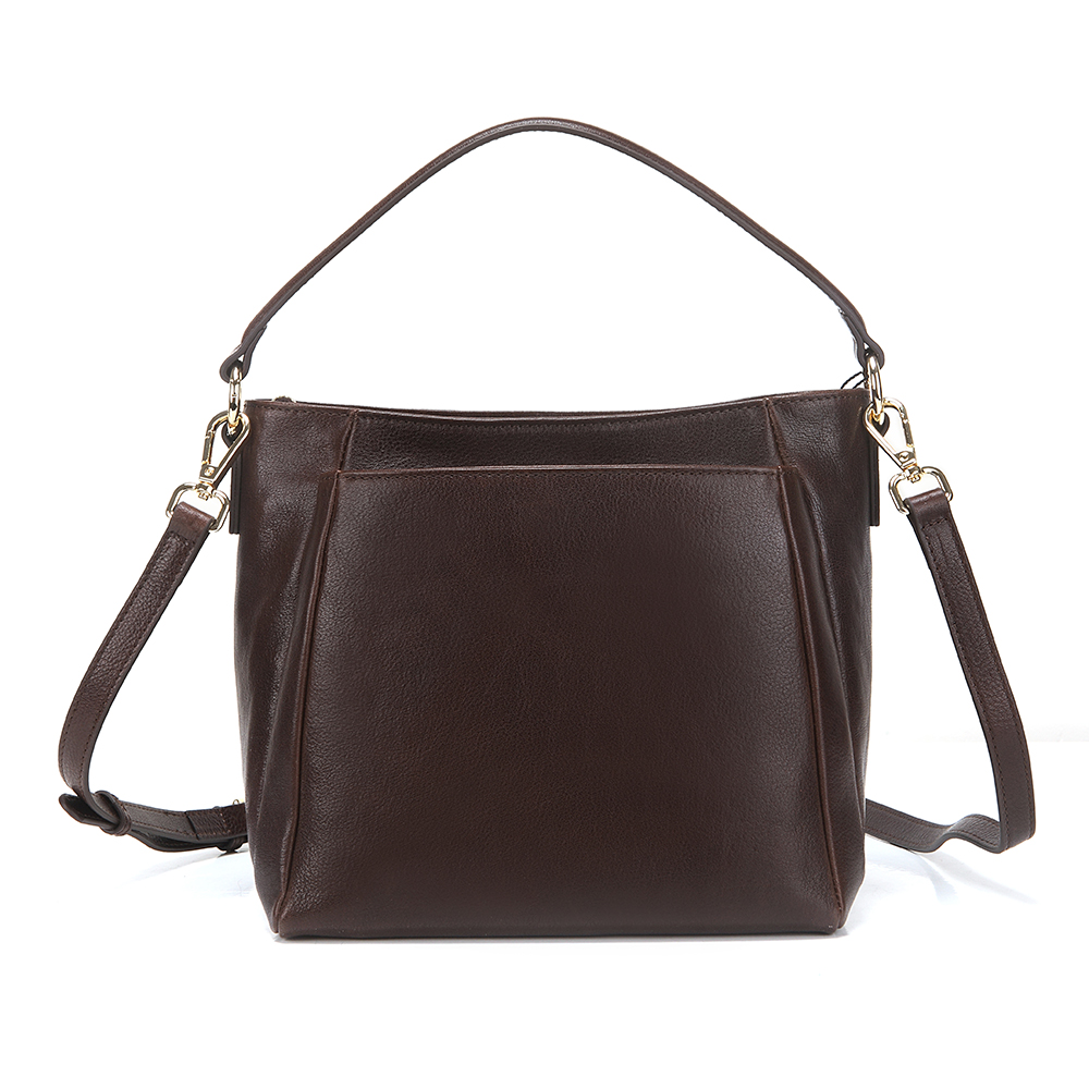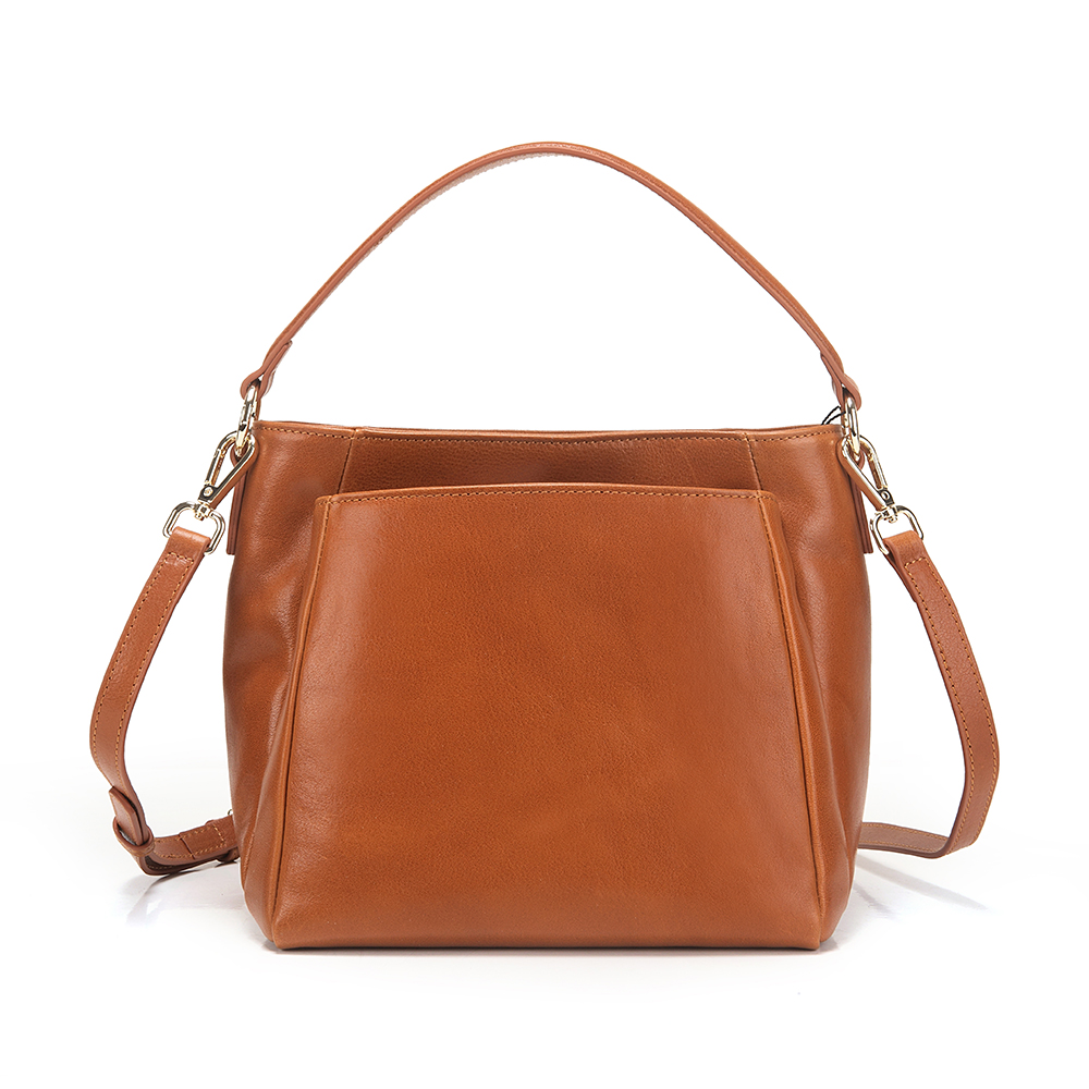 Top handle bucket bag with adjustable and removable sling strap. Made with genuine leather. 1 large zippered compartment with 2 smaller magnetic closure compartment.