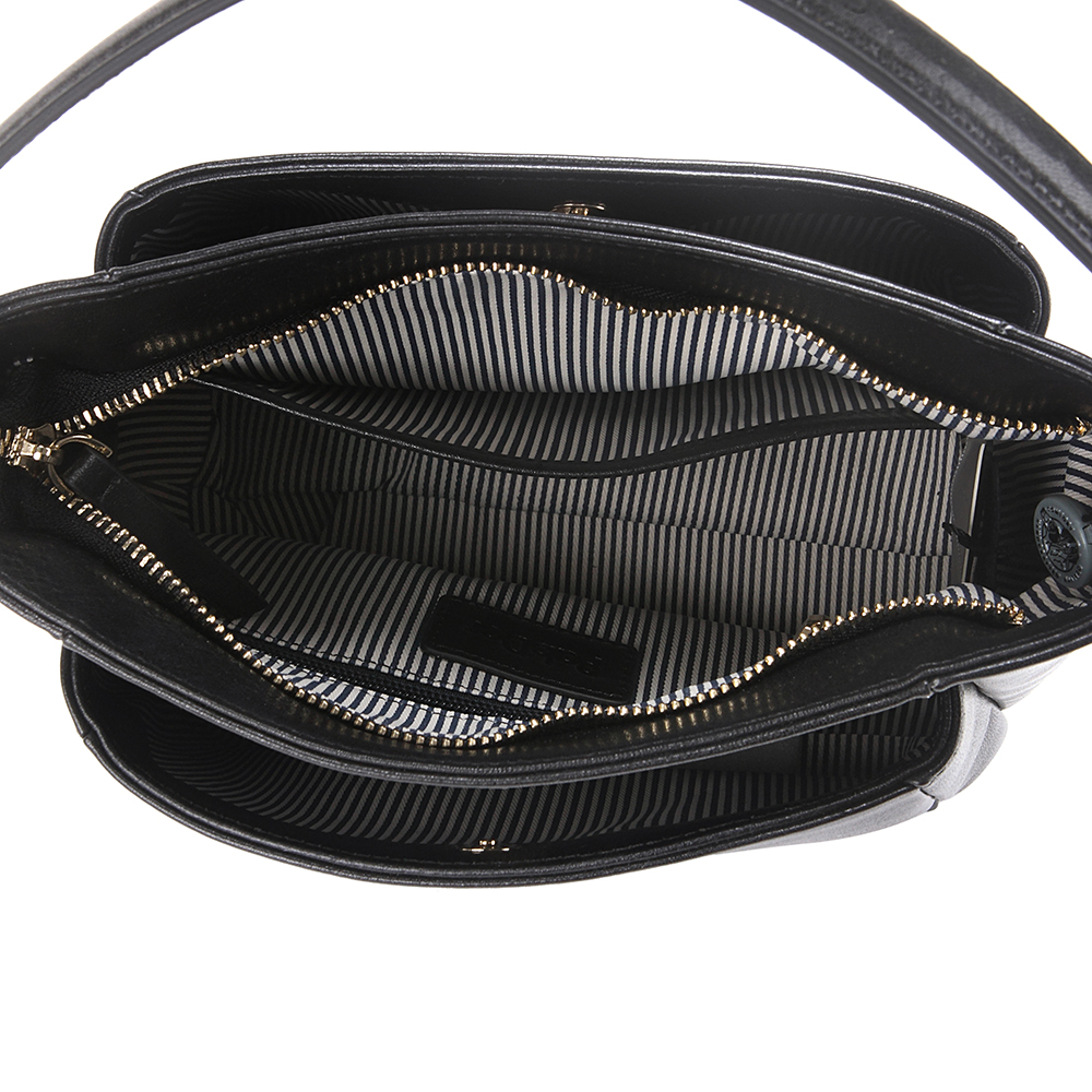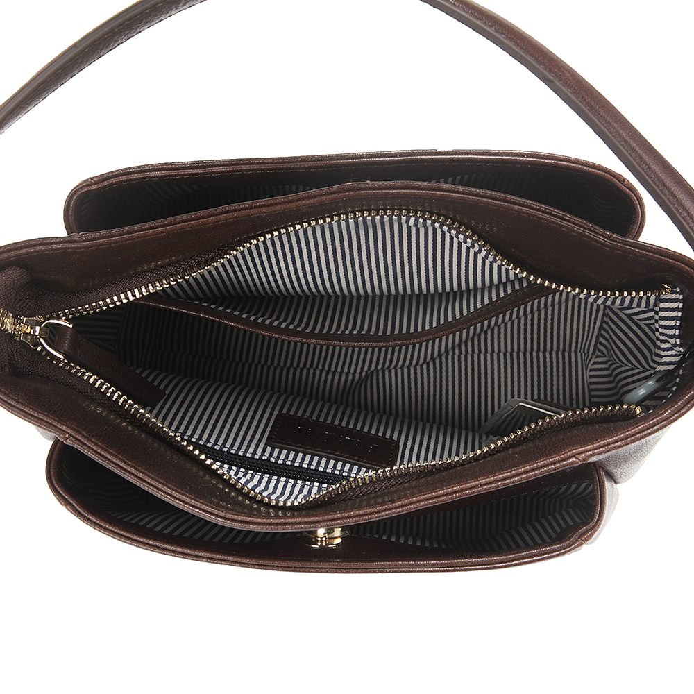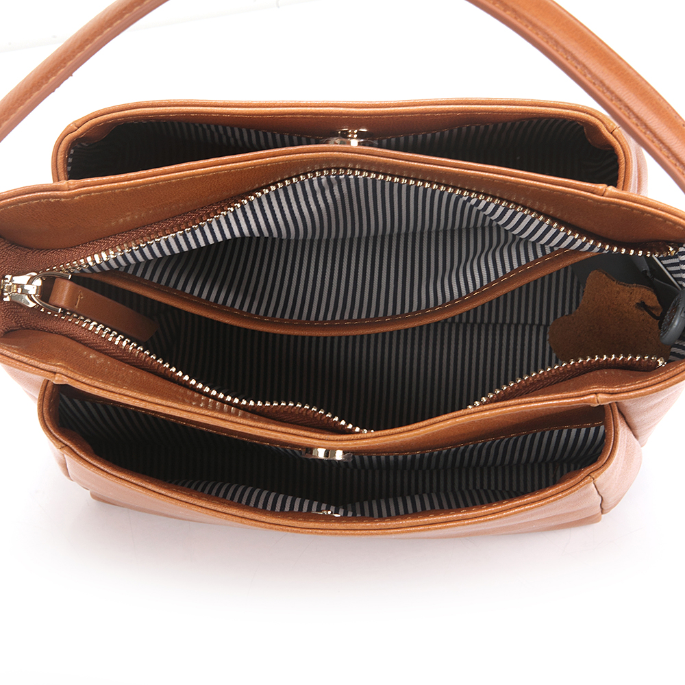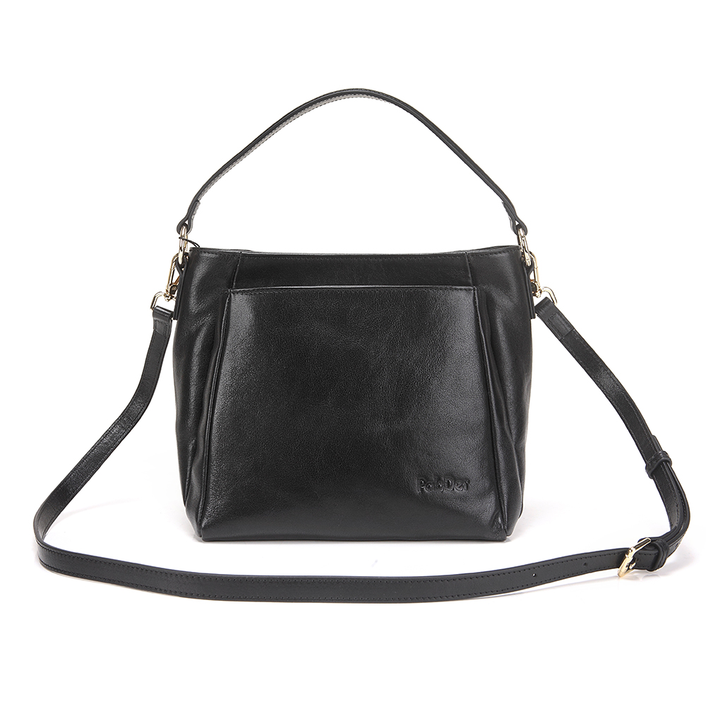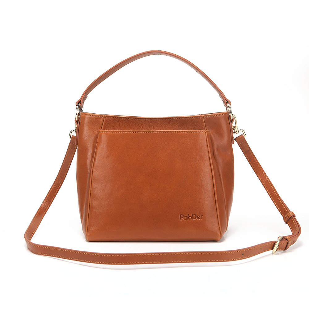 Top handle bucket bag with adjustable and removable sling strap. Made with genuine leather. 1 large zippered compartment with 2 smaller magnetic closure compartment.