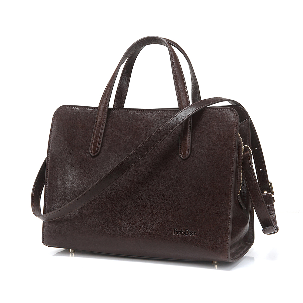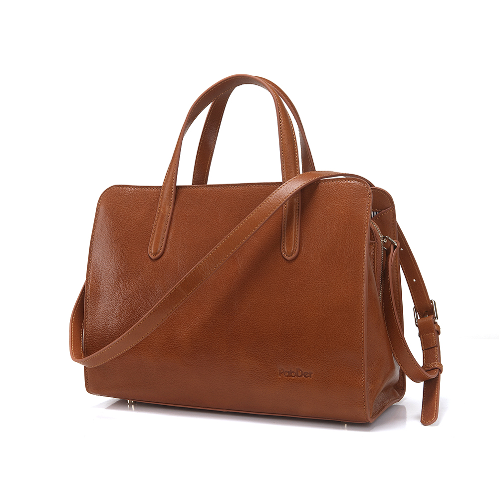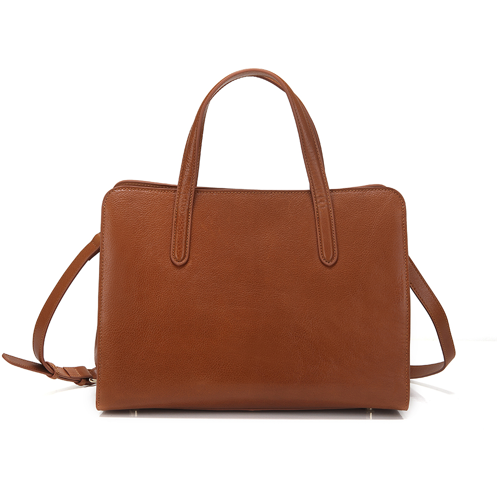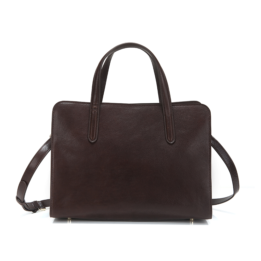 Spacious genuine leather top handle purse with 1 large center zippered compartment and 2 side magnetic closure compartment.