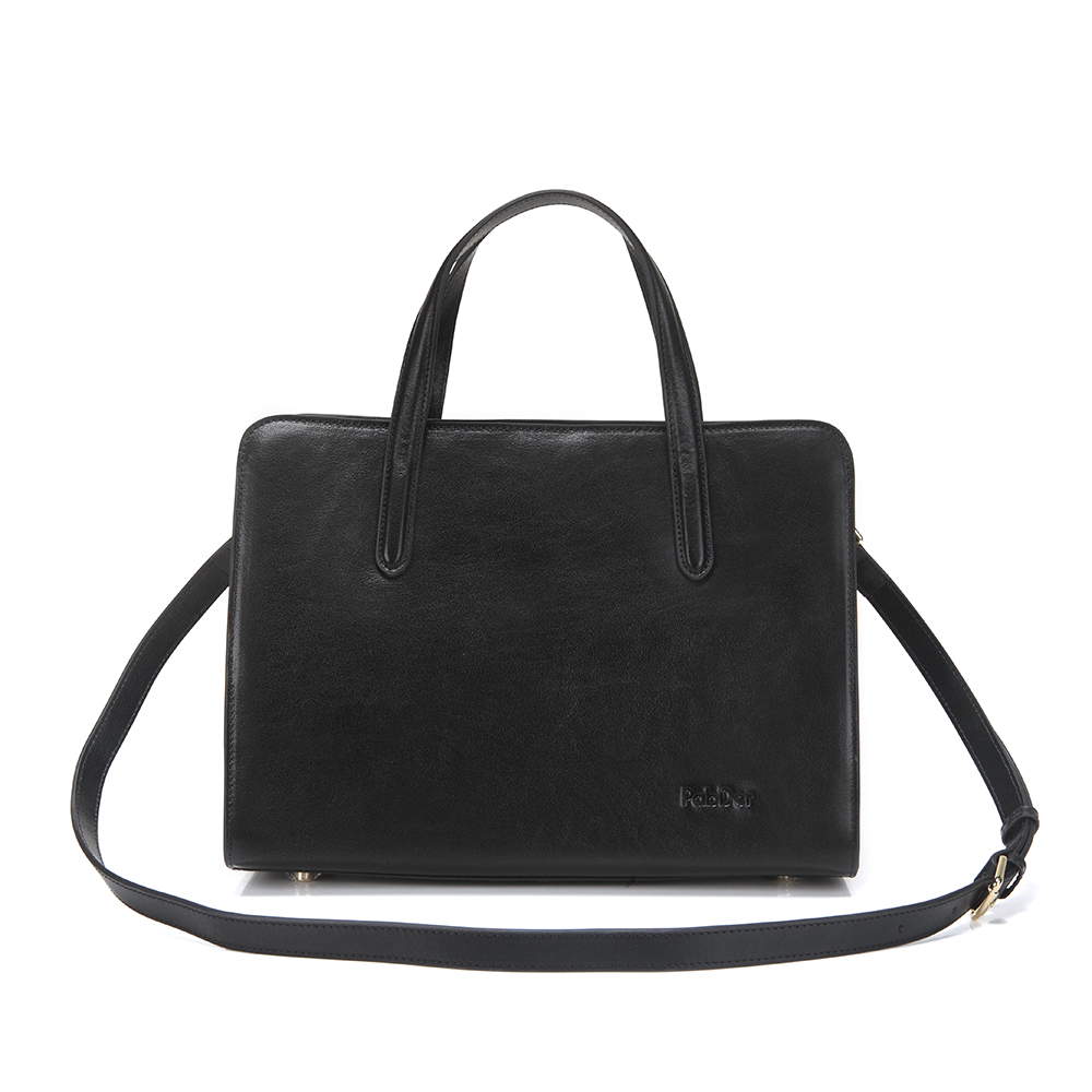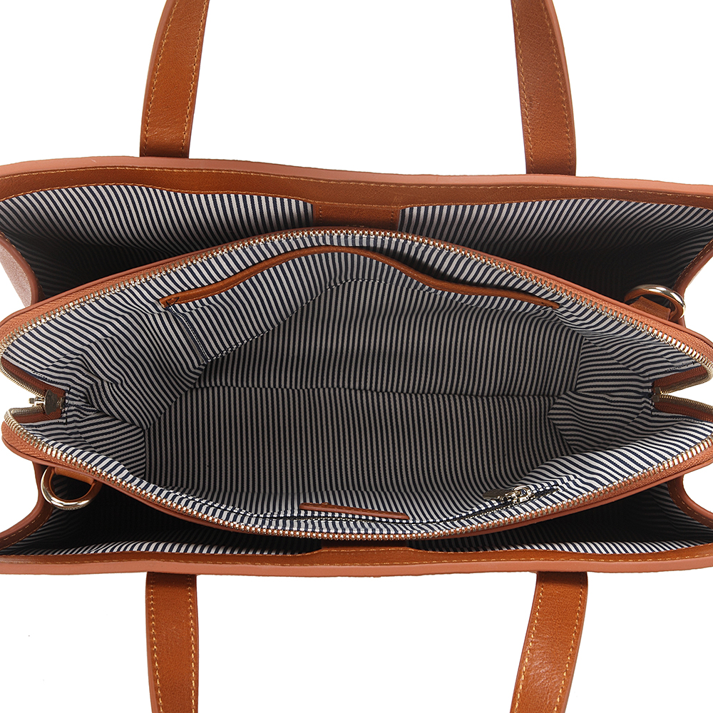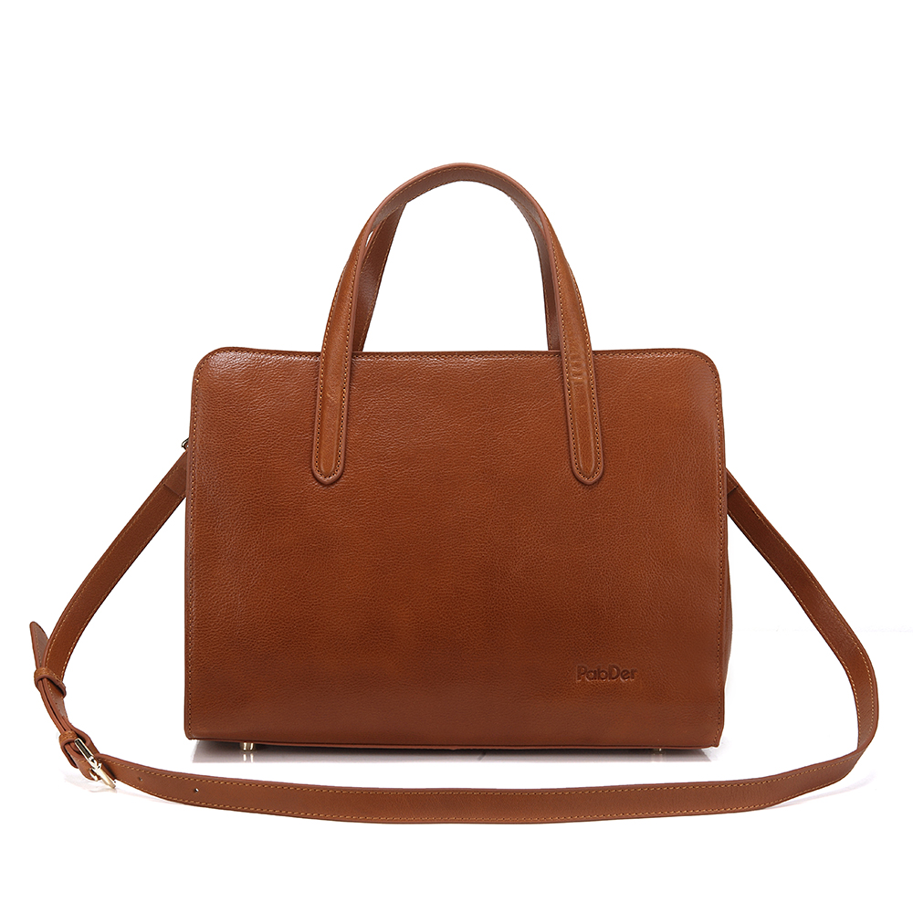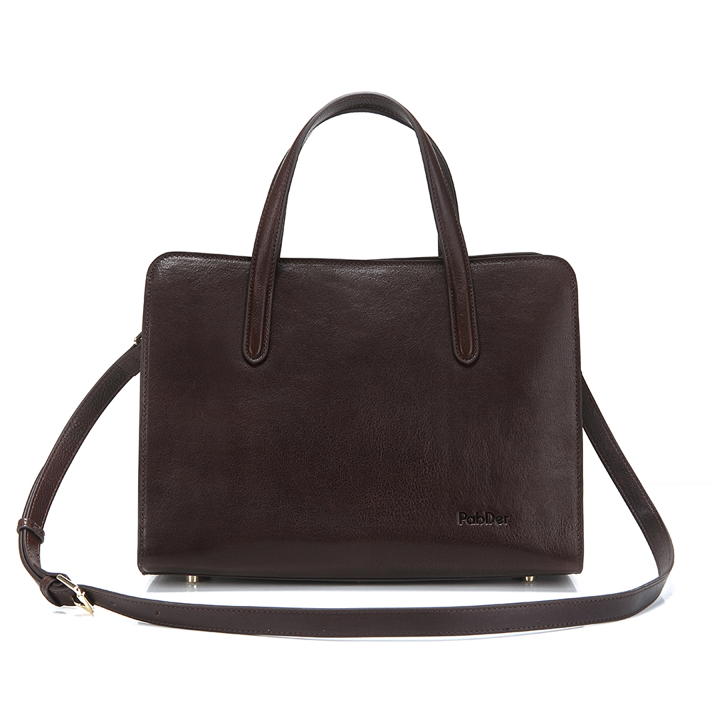 Spacious genuine leather top handle purse with 1 large center zippered compartment and 2 side magnetic closure compartment.