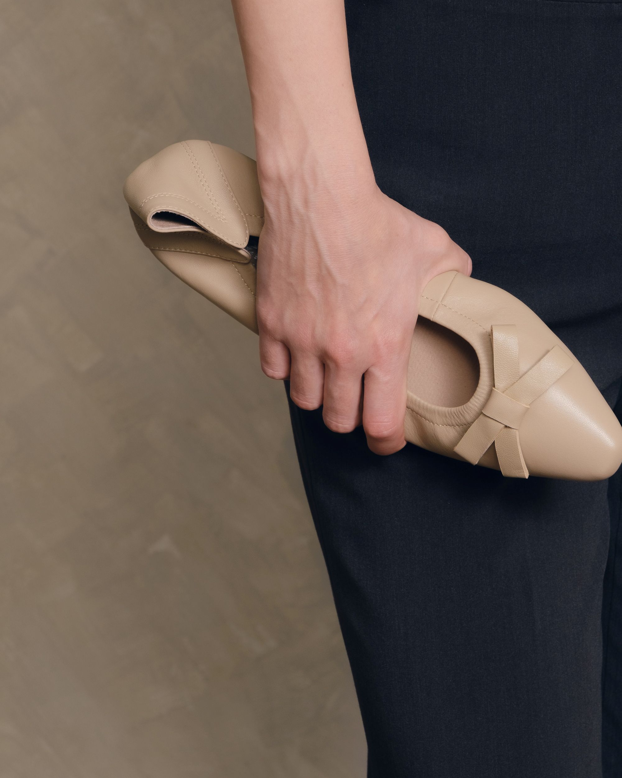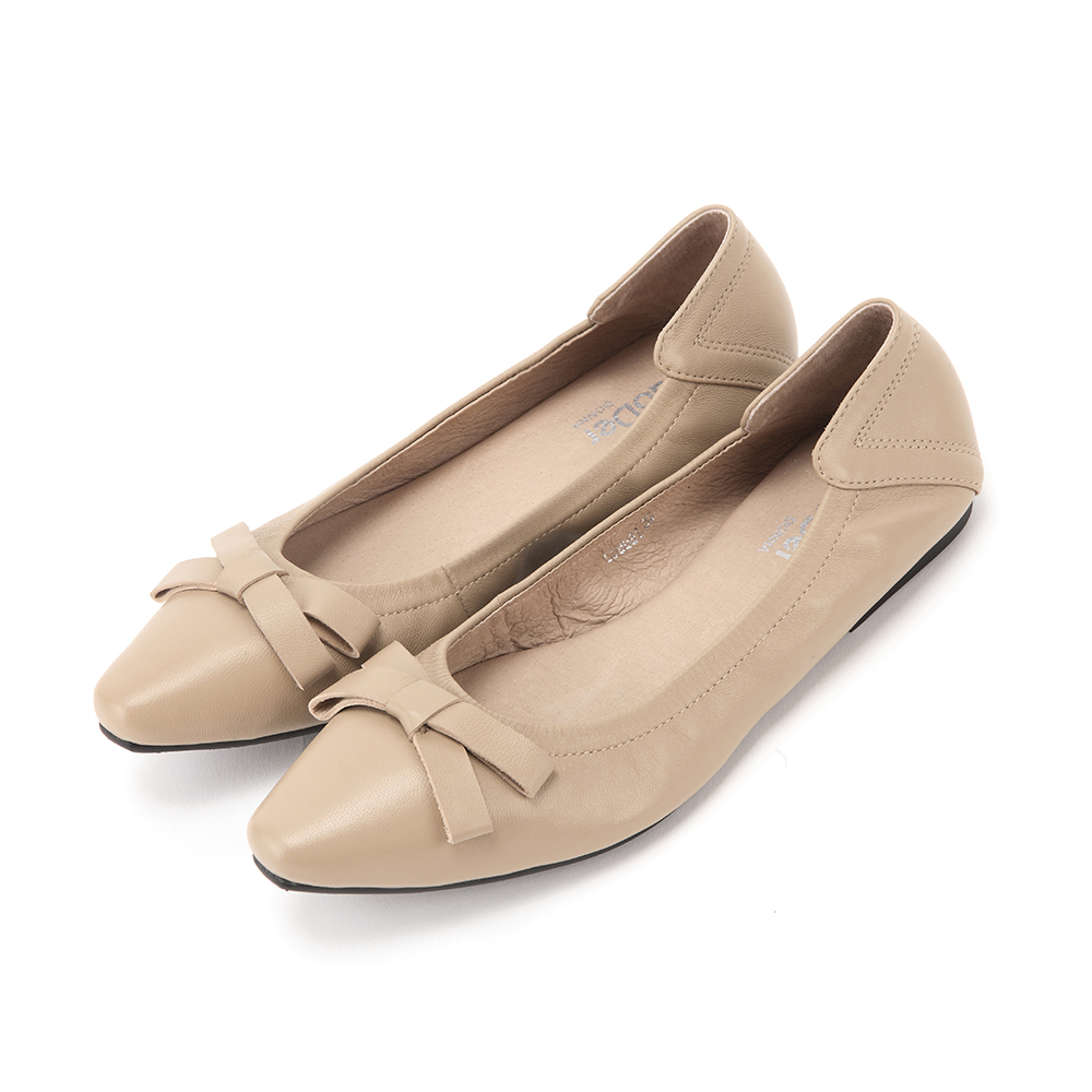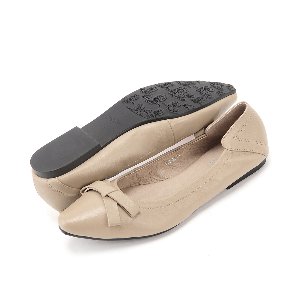 Ladies comfortable ballerina flats with pointed toe, bow decoration, elastic top line, bendable sole, soft insole, heel cap and made of genuine leather.